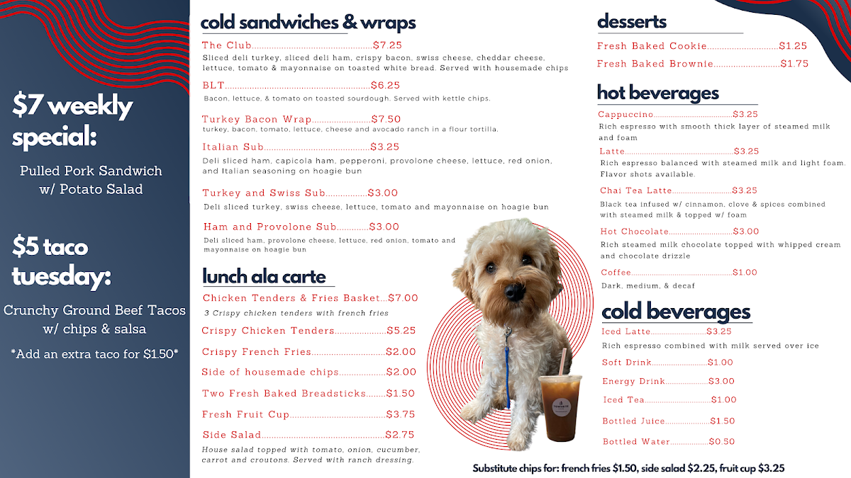 The menu is suitable for breakfast and lunch service, allowing customers to order quickly for pick-up or enjoy light meals on site. The available food and drink options provide both hot and cold selections, catering to various taste preferences and mealtime needs.