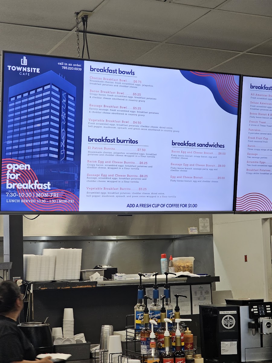 The menu at Townsite Cafe is organized to serve breakfast and lunch with a selection of food and beverages suitable for quick meals or casual dining. It features several groups of offerings designed to accommodate different preferences throughout the day.